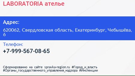 LABORATORIA, ателье по адресу 620062, Свердловская область, Екатеринбург, Чебышёва, 6 в дальнейшем Организация, размещена в следующих категориях: