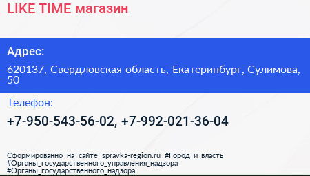LIKE TIME, магазин по адресу 620137, Свердловская область, Екатеринбург, Сулимова, 50 в дальнейшем Организация, размещена в следующих категориях: