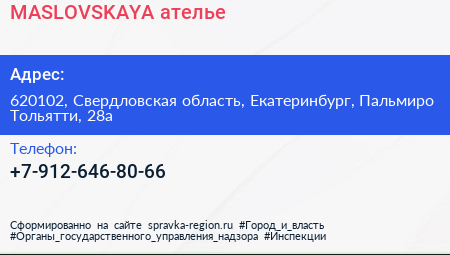 MASLOVSKAYA, ателье по адресу 620102, Свердловская область, Екатеринбург, Пальмиро Тольятти, 28а в дальнейшем Организация, размещена в следующих категориях: