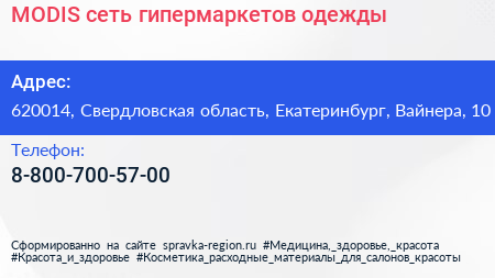 MODIS, сеть гипермаркетов одежды по адресу 620014, Свердловская область, Екатеринбург, Вайнера, 10 в дальнейшем Организация, размещена в следующих категориях: