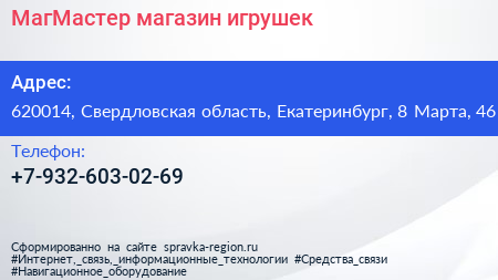 МагМастер, магазин игрушек по адресу 620014, Свердловская область, Екатеринбург, 8 Марта, 46 в дальнейшем Организация, размещена в следующих категориях: