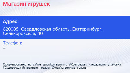 Магазин игрушек по адресу 620085, Свердловская область, Екатеринбург, Селькоровская, 40 в дальнейшем Организация, размещена в следующих категориях: