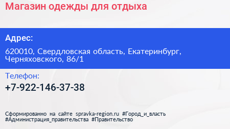 Магазин одежды для отдыха по адресу 620010, Свердловская область, Екатеринбург, Черняховского, 86/1 в дальнейшем Организация, размещена в следующих категориях: