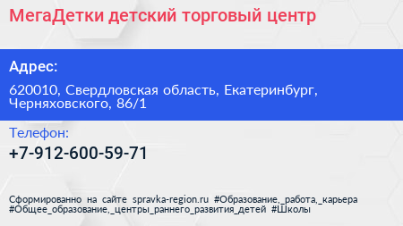 МегаДетки, детский торговый центр по адресу 620010, Свердловская область, Екатеринбург, Черняховского, 86/1 в дальнейшем Организация, размещена в следующих категориях: