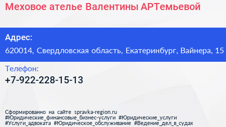 Меховое ателье Валентины АРТемьевой по адресу 620014, Свердловская область, Екатеринбург, Вайнера, 15 в дальнейшем Организация, размещена в следующих категориях: