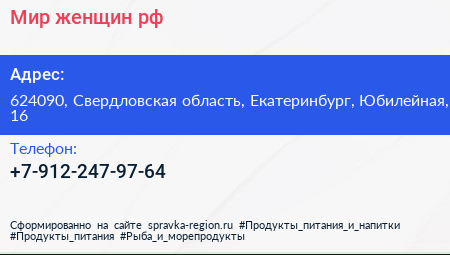 Мир женщин.рф по адресу 624090, Свердловская область, Екатеринбург, Юбилейная, 16 в дальнейшем Организация, размещена в следующих категориях:
