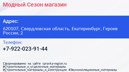 Модный Сезон, магазин по адресу 620107, Свердловская область, Екатеринбург, Героев России, 2 в дальнейшем Организация, размещена в следующих категориях: