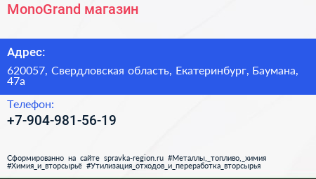 MonoGrand, магазин по адресу 620057, Свердловская область, Екатеринбург, Баумана, 47а в дальнейшем Организация, размещена в следующих категориях: