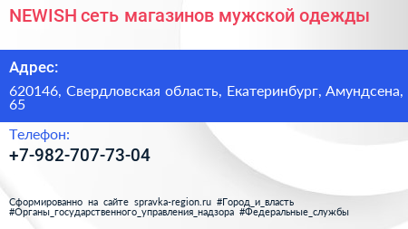 NEWISH, сеть магазинов мужской одежды по адресу 620146, Свердловская область, Екатеринбург, Амундсена, 65 в дальнейшем Организация, размещена в следующих категориях: