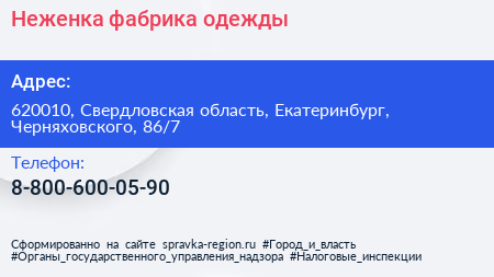 Неженка, фабрика одежды по адресу 620010, Свердловская область, Екатеринбург, Черняховского, 86/7 в дальнейшем Организация, размещена в следующих категориях: