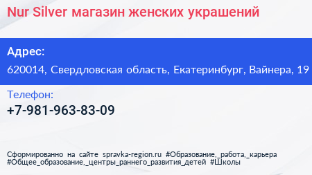 Nur Silver, магазин женских украшений по адресу 620014, Свердловская область, Екатеринбург, Вайнера, 19 в дальнейшем Организация, размещена в следующих категориях: