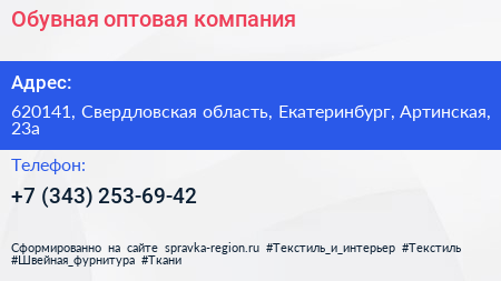 Обувная оптовая компания по адресу 620141, Свердловская область, Екатеринбург, Артинская, 23а в дальнейшем Организация, размещена в следующих категориях: