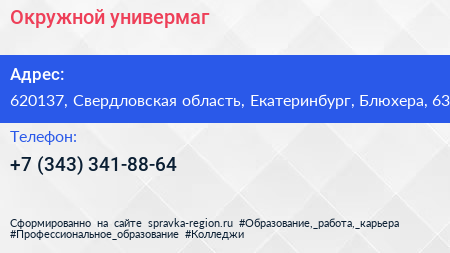 Окружной универмаг по адресу 620137, Свердловская область, Екатеринбург, Блюхера, 63 в дальнейшем Организация, размещена в следующих категориях: