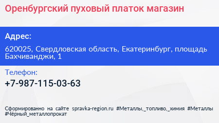 Оренбургский пуховый платок, магазин по адресу 620025, Свердловская область, Екатеринбург, площадь Бахчиванджи, 1 в дальнейшем Организация, размещена в следующих категориях: