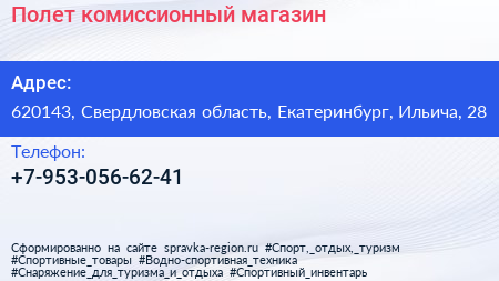 Полет, комиссионный магазин по адресу 620143, Свердловская область, Екатеринбург, Ильича, 28 в дальнейшем Организация, размещена в следующих категориях: