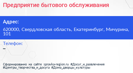 Предприятие бытового обслуживания по адресу 620000, Свердловская область, Екатеринбург, Мичурина, 101 в дальнейшем Организация, размещена в следующих категориях:
