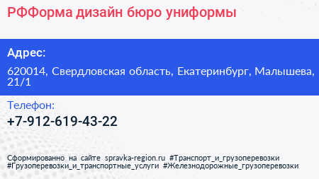 РФФорма, дизайн-бюро униформы по адресу 620014, Свердловская область, Екатеринбург, Малышева, 21/1 в дальнейшем Организация, размещена в следующих категориях: