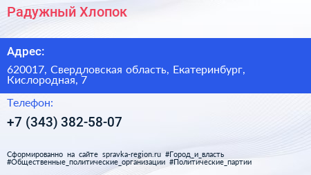 Радужный Хлопок по адресу 620017, Свердловская область, Екатеринбург, Кислородная, 7 в дальнейшем Организация, размещена в следующих категориях: