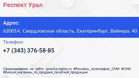 Респект-Урал по адресу 620014, Свердловская область, Екатеринбург, Вайнера, 40 в дальнейшем Организация, размещена в следующих категориях: