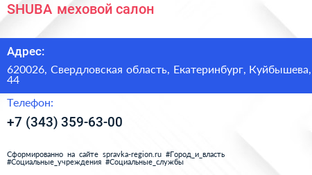SHUBA, меховой салон по адресу 620026, Свердловская область, Екатеринбург, Куйбышева, 44 в дальнейшем Организация, размещена в следующих категориях: