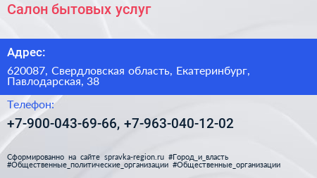 Салон бытовых услуг по адресу 620087, Свердловская область, Екатеринбург, Павлодарская, 38 в дальнейшем Организация, размещена в следующих категориях: