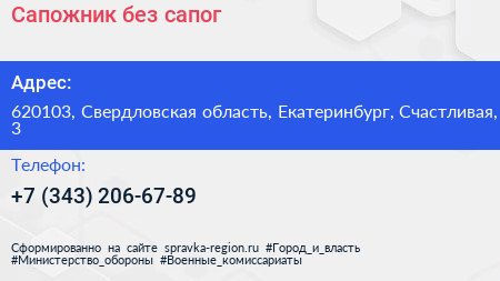 Сапожник без сапог по адресу 620103, Свердловская область, Екатеринбург, Счастливая, 3 в дальнейшем Организация, размещена в следующих категориях: