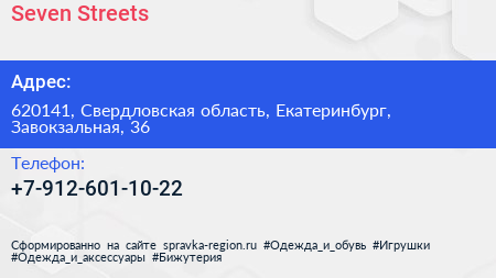 Seven Streets по адресу 620141, Свердловская область, Екатеринбург, Завокзальная, 36 в дальнейшем Организация, размещена в следующих категориях: