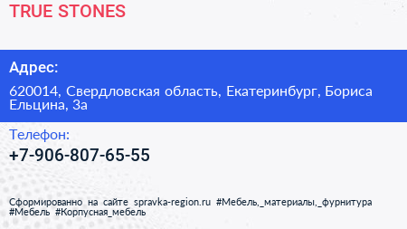 TRUE STONES по адресу 620014, Свердловская область, Екатеринбург, Бориса Ельцина, 3а в дальнейшем Организация, размещена в следующих категориях: