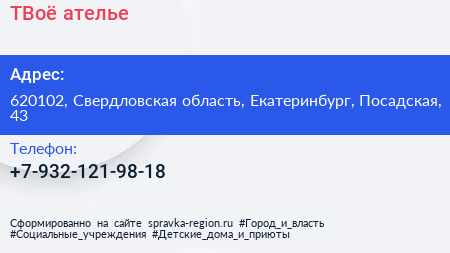 ТВоё ателье по адресу 620102, Свердловская область, Екатеринбург, Посадская, 43 в дальнейшем Организация, размещена в следующих категориях: