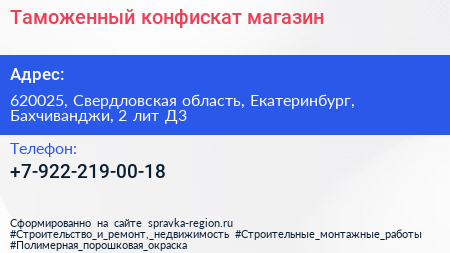 Таможенный конфискат, магазин по адресу 620025, Свердловская область, Екатеринбург, Бахчиванджи, 2 лит Д3 в дальнейшем Организация, размещена в следующих категориях:
