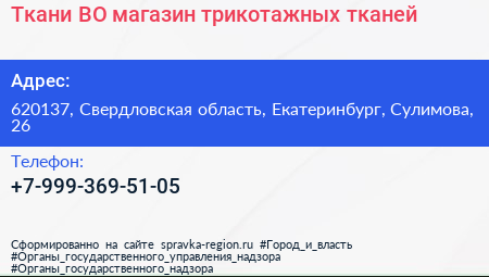 Ткани-ВО!, магазин трикотажных тканей по адресу 620137, Свердловская область, Екатеринбург, Сулимова, 26 в дальнейшем Организация, размещена в следующих категориях: