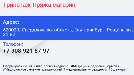 Трикотаж & Пряжа, магазин по адресу 620023, Свердловская область, Екатеринбург, Рощинская, 21 к2 в дальнейшем Организация, размещена в следующих категориях:
