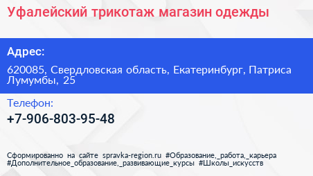 Уфалейский трикотаж, магазин одежды по адресу 620085, Свердловская область, Екатеринбург, Патриса Лумумбы, 25 в дальнейшем Организация, размещена в следующих категориях:
