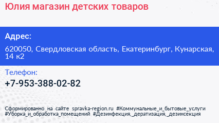 Юлия, магазин детских товаров по адресу 620050, Свердловская область, Екатеринбург, Кунарская, 14 к2 в дальнейшем Организация, размещена в следующих категориях: