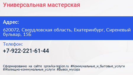 Универсальная мастерская по адресу 620072, Свердловская область, Екатеринбург, Сиреневый бульвар, 15Б в дальнейшем Организация, размещена в следующих категориях: