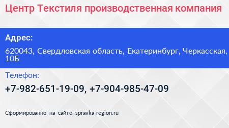 Центр Текстиля, производственная компания по адресу 620043, Свердловская область, Екатеринбург, Черкасская, 10Б в дальнейшем Организация, размещена в следующих категориях: