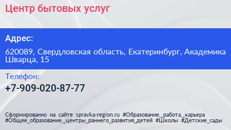 Центр бытовых услуг по адресу 620089, Свердловская область, Екатеринбург, Академика Шварца, 15 в дальнейшем Организация, размещена в следующих категориях: