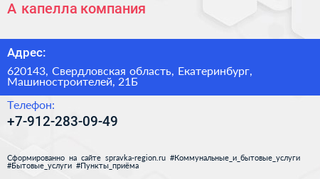 А капелла, компания по адресу 620143, Свердловская область, Екатеринбург, Машиностроителей, 21Б в дальнейшем Организация, размещена в следующих категориях: