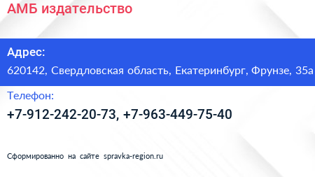АМБ, издательство по адресу 620142, Свердловская область, Екатеринбург, Фрунзе, 35а в дальнейшем Организация, размещена в следующих категориях: