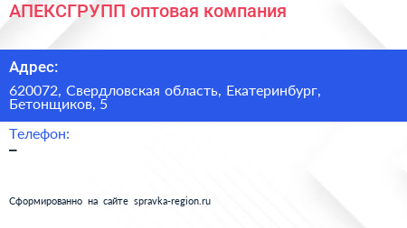 АПЕКСГРУПП, оптовая компания по адресу 620072, Свердловская область, Екатеринбург, Бетонщиков, 5 в дальнейшем Организация, размещена в следующих категориях: