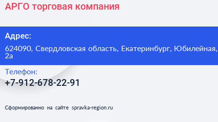 АРГО, торговая компания по адресу 624090, Свердловская область, Екатеринбург, Юбилейная, 2а в дальнейшем Организация, размещена в следующих категориях: