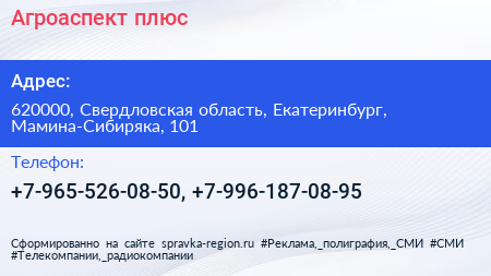 Агроаспект плюс по адресу 620000, Свердловская область, Екатеринбург, Мамина-Сибиряка, 101 в дальнейшем Организация, размещена в следующих категориях:
