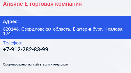Альянс Е, торговая компания по адресу 620146, Свердловская область, Екатеринбург, Чкалова, 124 в дальнейшем Организация, размещена в следующих категориях:
