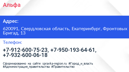 Альфа по адресу 620091, Свердловская область, Екатеринбург, Фронтовых Бригад, 13 в дальнейшем Организация, размещена в следующих категориях:
