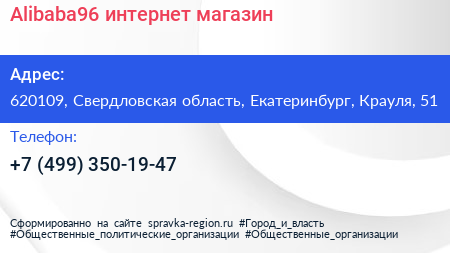 Alibaba96, интернет-магазин по адресу 620109, Свердловская область, Екатеринбург, Крауля, 51 в дальнейшем Организация, размещена в следующих категориях: