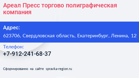 Ареал-Пресс, торгово-полиграфическая компания по адресу 623706, Свердловская область, Екатеринбург, Ленина, 12 в дальнейшем Организация, размещена в следующих категориях: