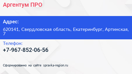 Аргентум ПРО по адресу 620141, Свердловская область, Екатеринбург, Артинская, 7 в дальнейшем Организация, размещена в следующих категориях: