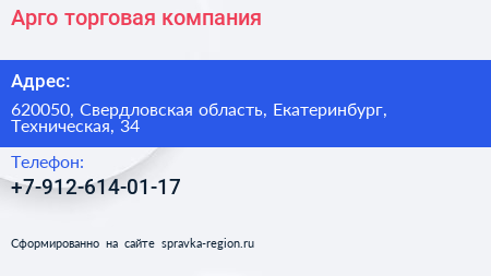 Арго, торговая компания по адресу 620050, Свердловская область, Екатеринбург, Техническая, 34 в дальнейшем Организация, размещена в следующих категориях: