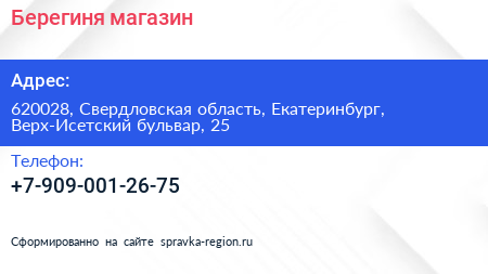 Берегиня, магазин по адресу 620028, Свердловская область, Екатеринбург, Верх-Исетский бульвар, 25 в дальнейшем Организация, размещена в следующих категориях: