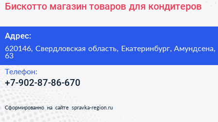 Бискотто, магазин товаров для кондитеров по адресу 620146, Свердловская область, Екатеринбург, Амундсена, 63 в дальнейшем Организация, размещена в следующих категориях: